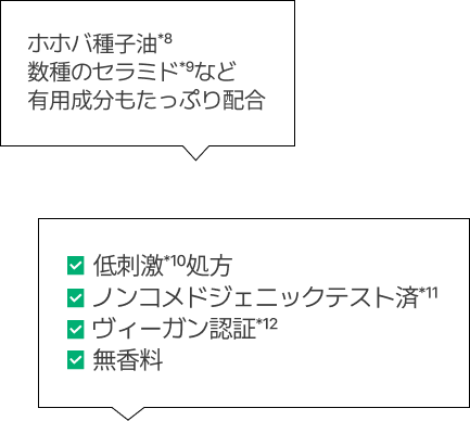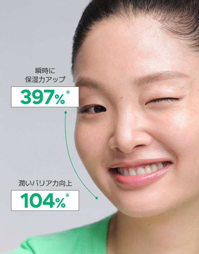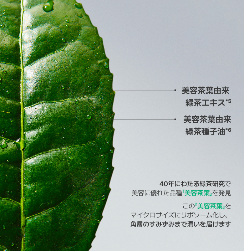 *1 使用感のこと(自社製品内において)*2 in vitro試験結果:スーパーグリーンティー™と一般的なヒアルロン酸の有用性の比較による(社内比較)、 原料特性に限る *3 チャ葉エキス、チャ種子油(全て保湿成分) *4 角質層まで *5 チャ葉エキス(保湿成分) *6 チャ種子油(保湿成分) *7 セラミドNP(保湿成分)*8 保湿成分 *9 セラミドNP、セラミドNS、セラミドAS、セラミドAP、セラミドEOP(全て保湿成分) *10 低刺激テスト済/自社調べ(すべての人に皮膚刺激が起こらないというわけではありません) *11 すべての方にコメド(ニキビのもと)ができないというわけではありません *12 韓国ヴィーガン認証院にて